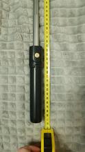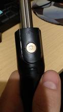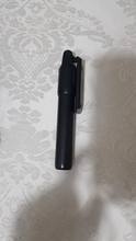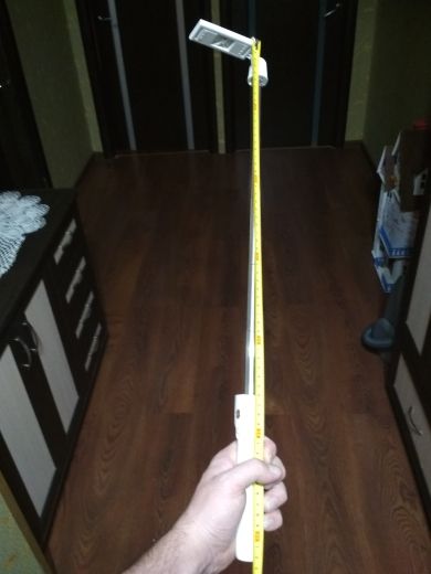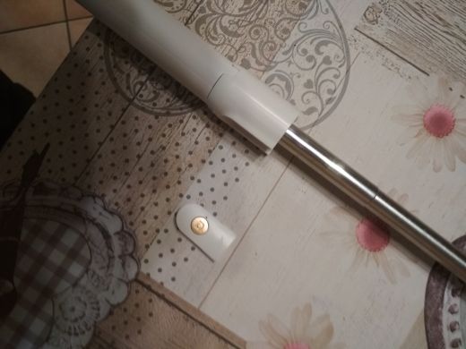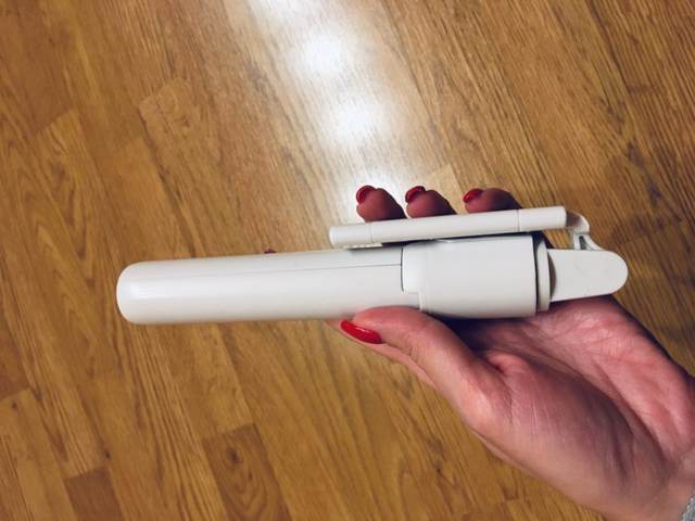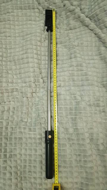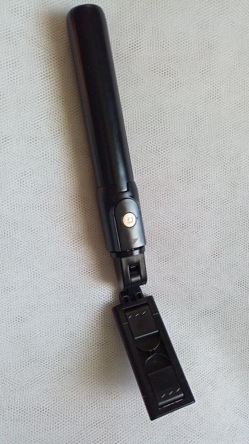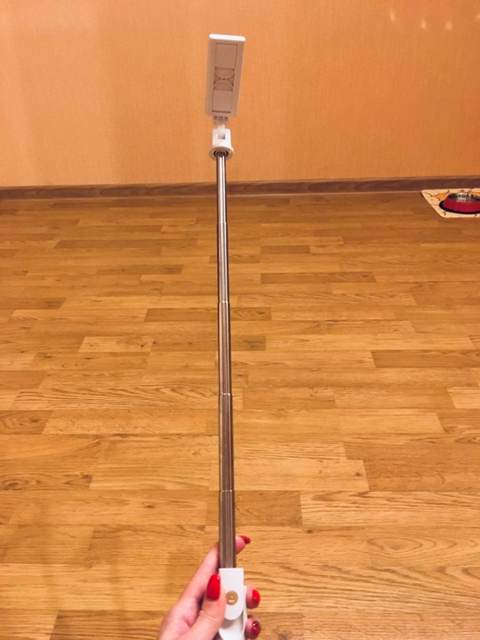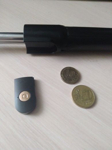 The goods reached Moscow in a month and a half. The quality is excellent. The button is removed. Works from Bluetooth. The length of the stick in disassembled condition is 62.5 cm, assembled 19.5 cm.