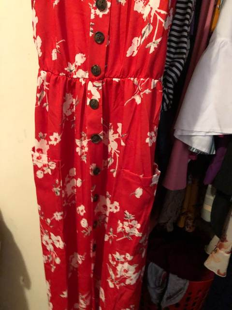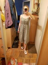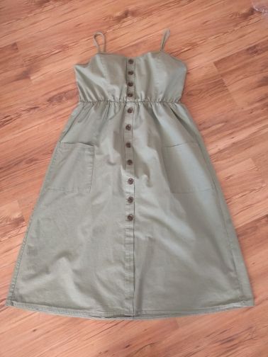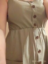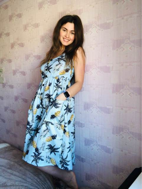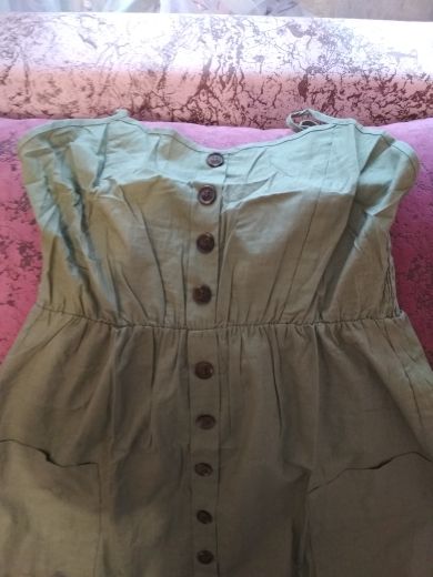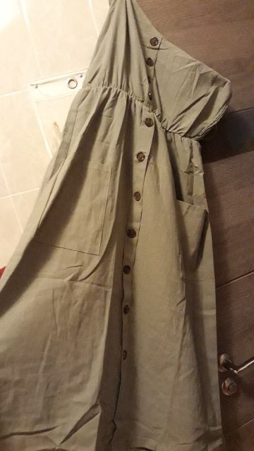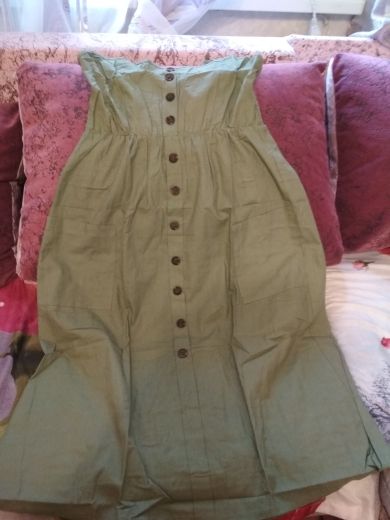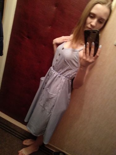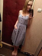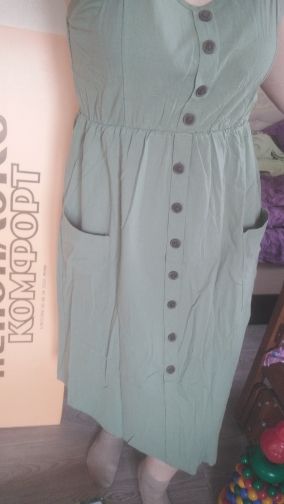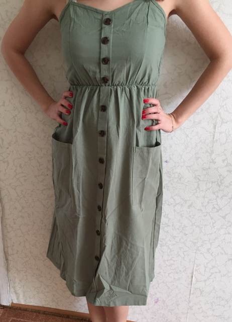 Sarafan liked. On rus 48 size took xl. It was possible to take more, but i liked the style, quality. Synthetic fabric, a little stretch. But then it will not crumble. Fake buttons, two good deep pockets. Behind is a good not tight elastic band on the belt. The parcel went long, 35 days to almaty. But still, thanks to the store.