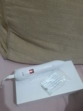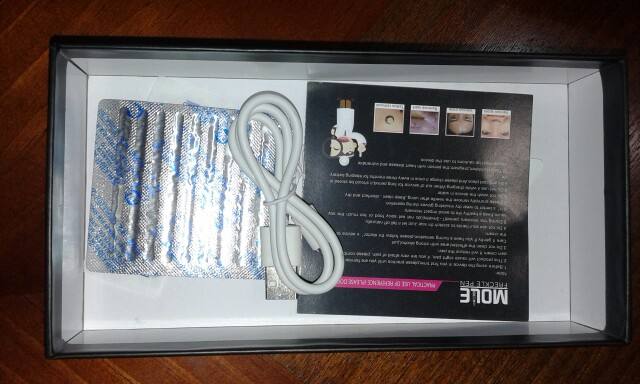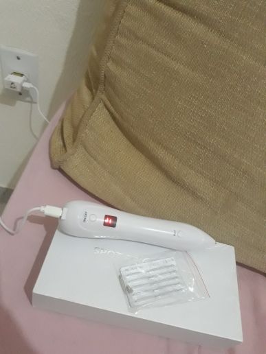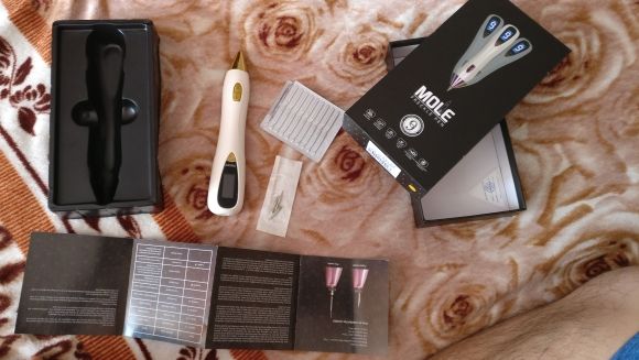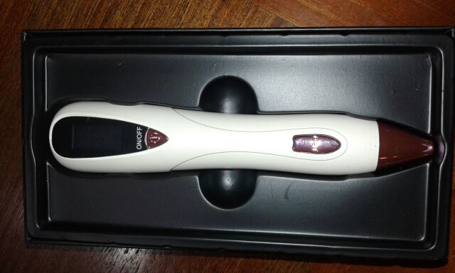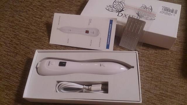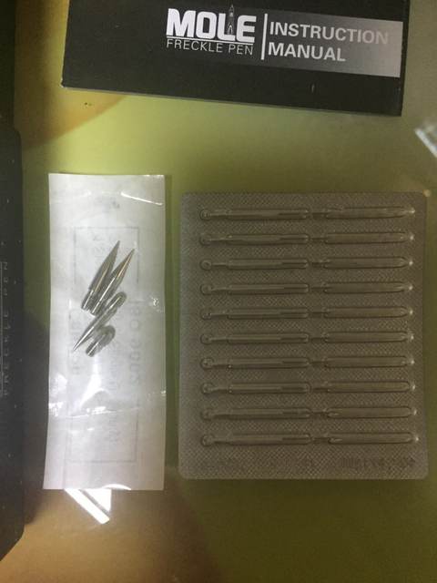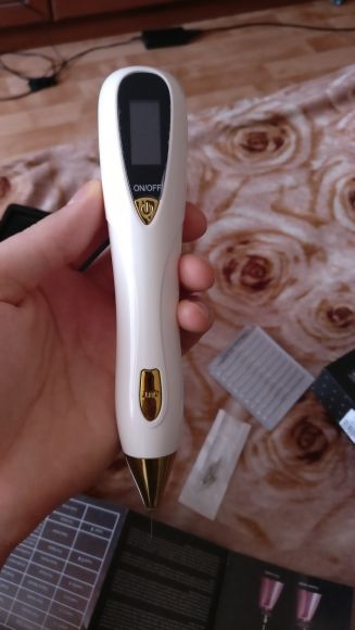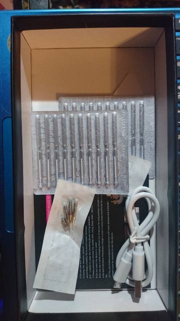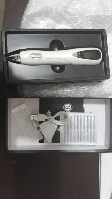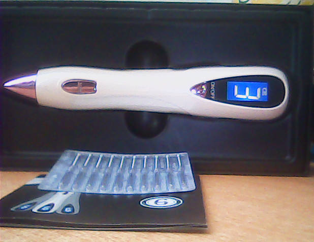 The kit includes a laser pen (9 capacities) 4 nozzles, 10 needles, english manual, usb cord and a box. Tried on an orange, everything works. I'll try on myself later.