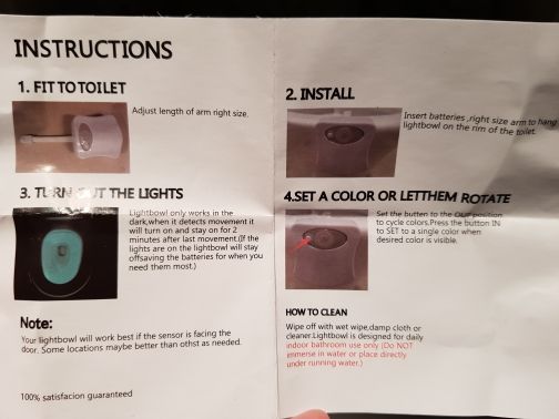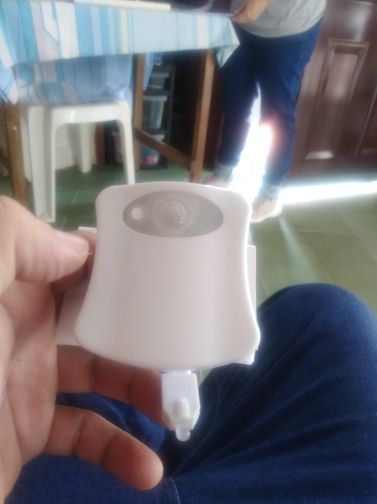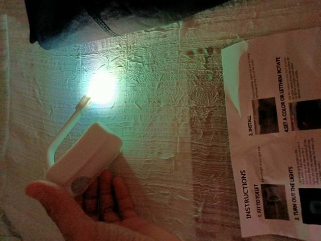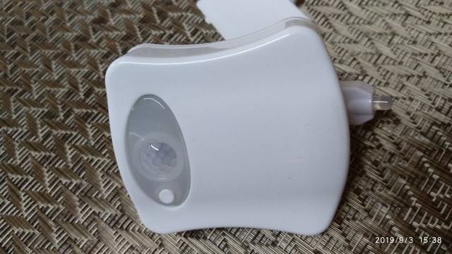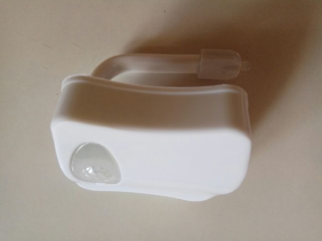 Illumination for the toilet. Came in a soft, blown and shockproof package. The thing is interesting, comfortable, light. Hung on the toilet under the seat and does not interfere. Works for movement. It shines enough time to perform short-term actions. Pleasantly changes color, which is very soft and not bright. Especially convenient when the family has small children!