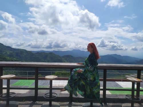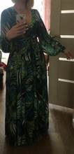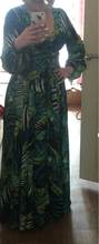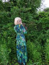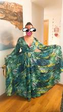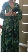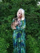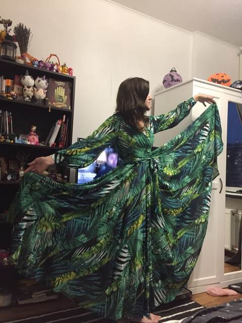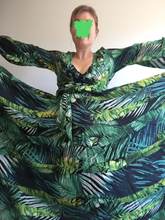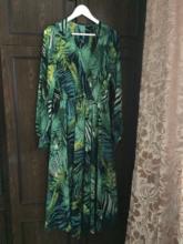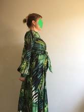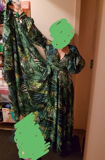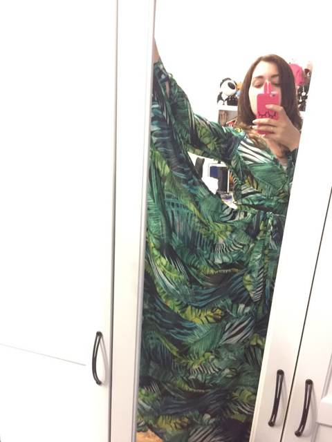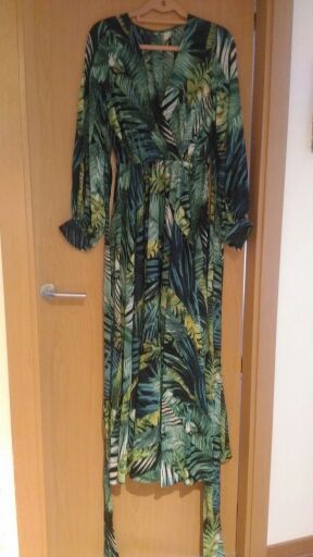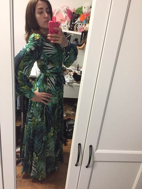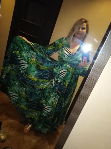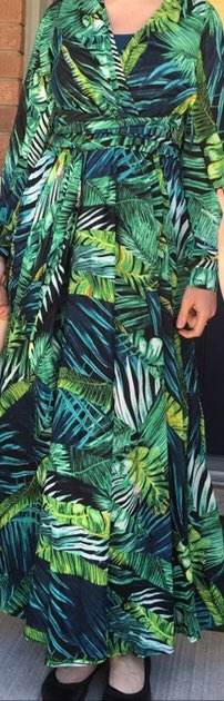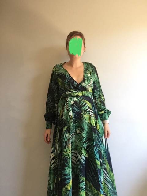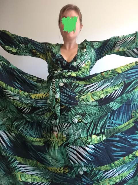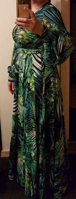 This dress is so lovely!! I love it. It will be perfect for. Tropical themed party I’m going to attend. The material feels lovely and thick and there is a lot of fabric. Dress has elastic waist and long sleeves. Lovely long belt. There isn’t a lot of fabric in the bust area, so if bigger busted, it will be more open- not as much fabric to make the deep V less. I am 59kg (currently 23weeks pregnant) and 163 cm tall. Dress sits just on the ground with no shoes.