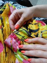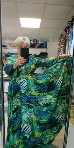 Moscow reached quickly in 9 days. Track tracked. Packed in a normal postal cellophane bag. Put the fact that i ordered the size of xxl (50 suitable). The material is slightly transparent, the dress is weighty. The composition of the fabric is not written anywhere. Stitched exactly, but i came with different cuffs (the dispute returned some money). The length of the dress skirt is 100 cm. On height 164 cm in the floor. In the belt is an elastic band. I had to change the buttons on the cuffs, so that there was no difference. Shortened the hem of the dress by 15 cm. The material is easily crumpled, almost does not iron, but does not crumple. The belt is very long. Cut it off from the dress and took one part of it, inserted the corsage inside and turned out a wonderful belt. In the chest inserted a triangular insert of cut material from the hem. Changed-now everything suits. Beautiful dress for summer, skirt sun. Thank you store!